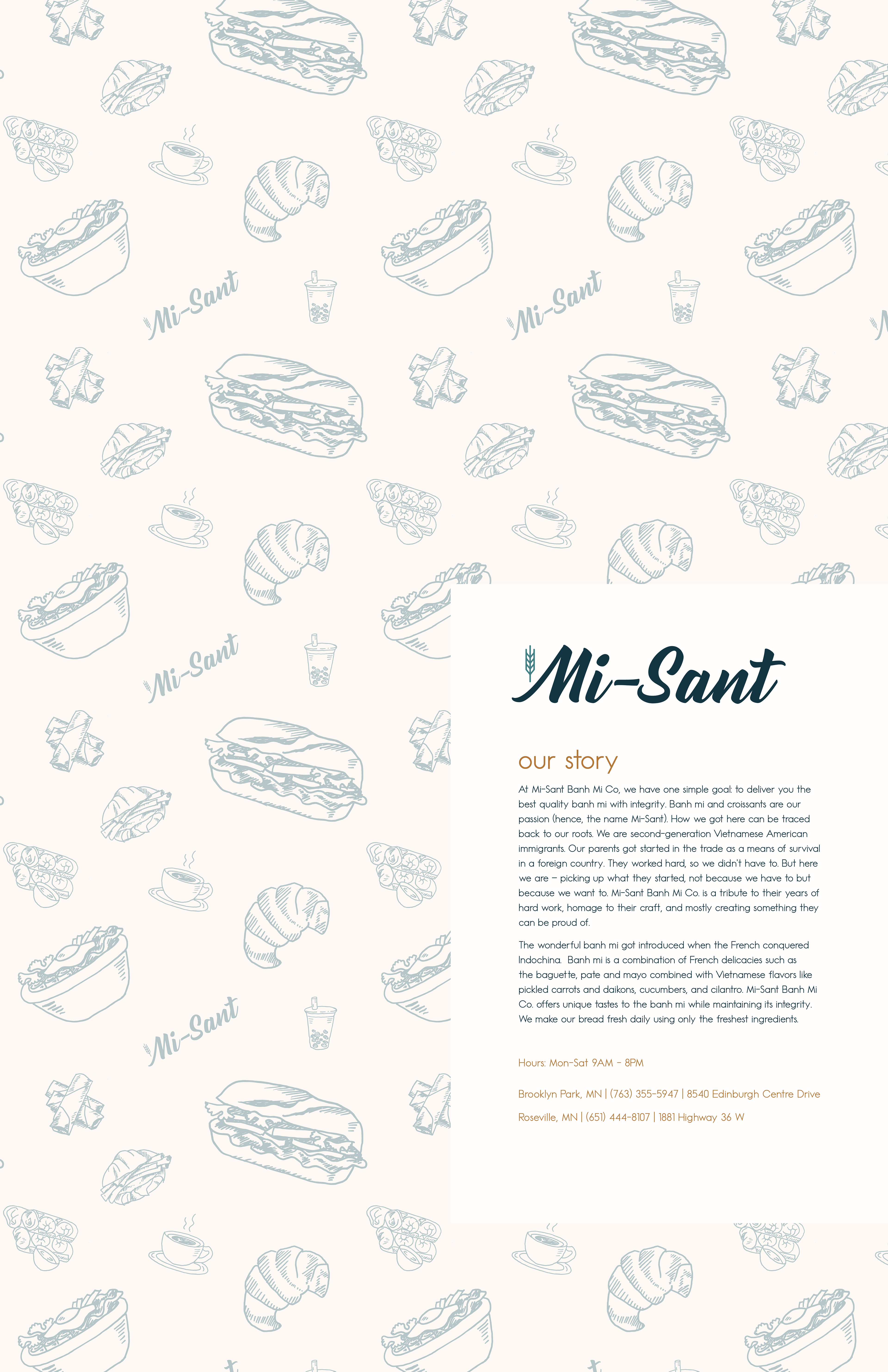 The Mi-Sant project entailed a restaurant menu redesign for a typography class. My objective was to revamp the restaurant's current menu and develop digital marketing materials to elevate its promotional efforts.